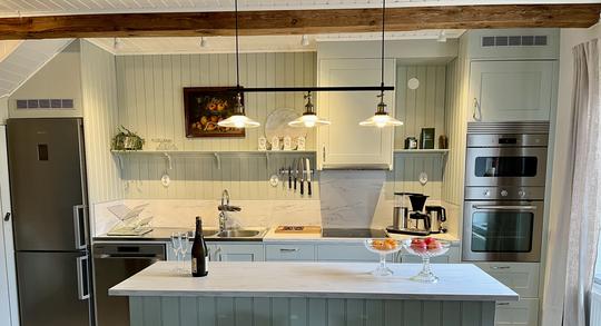 Bottenvåningen erbjuder generöst utrymme för social samvaro och bekväm matlagning. Den öppna planlösningen möjliggör ett naturligt flöde mellan det moderna och fullt utrustade köket och matplatsen, vilket skapar en inbjudande atmosfär för umgänge med vänner och familj. Med tillräckligt med plats för alla att samlas och dela måltider tillsammans blir det enkelt att skapa minnesvärda stunder under er vistelse. Det rymliga badrummet är utrustat med en bekväm dusch. Dessutom finns ett stort huvudsovrum med plats för två personer och generösa garderober för förvaring av era tillhörigheter. Boendet är utformat för att vara tillgängligt för personer med funktionsvariation.